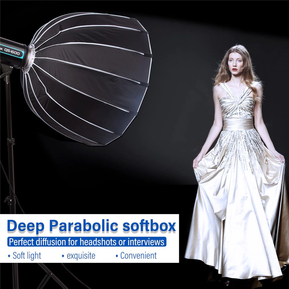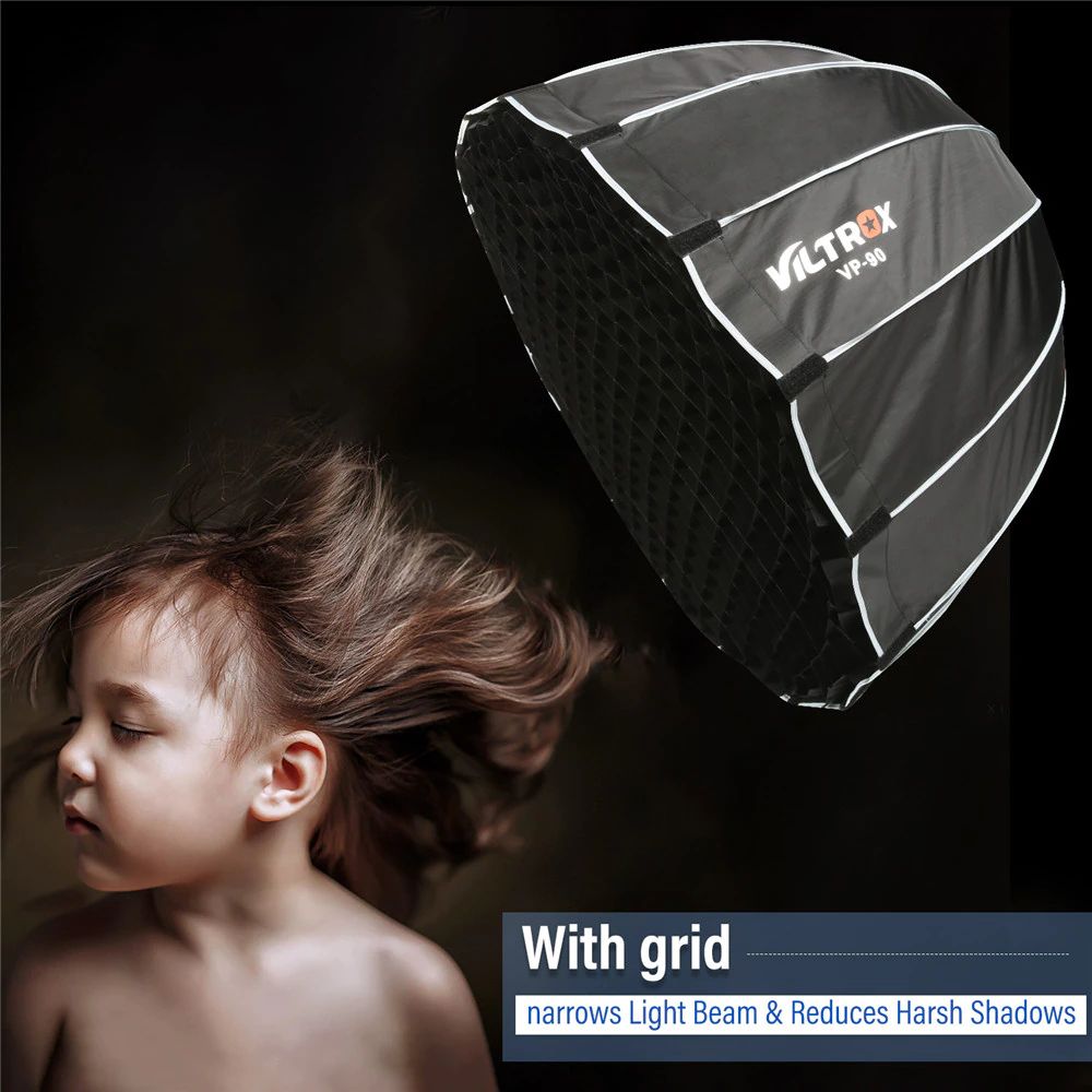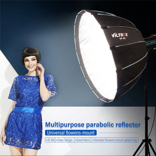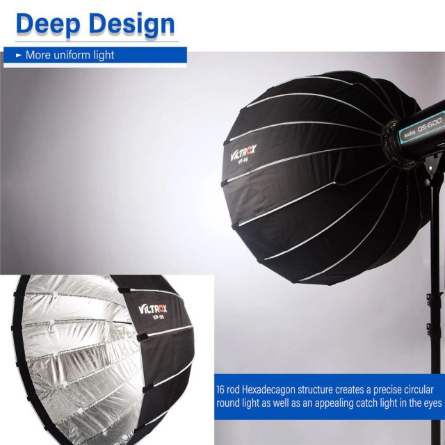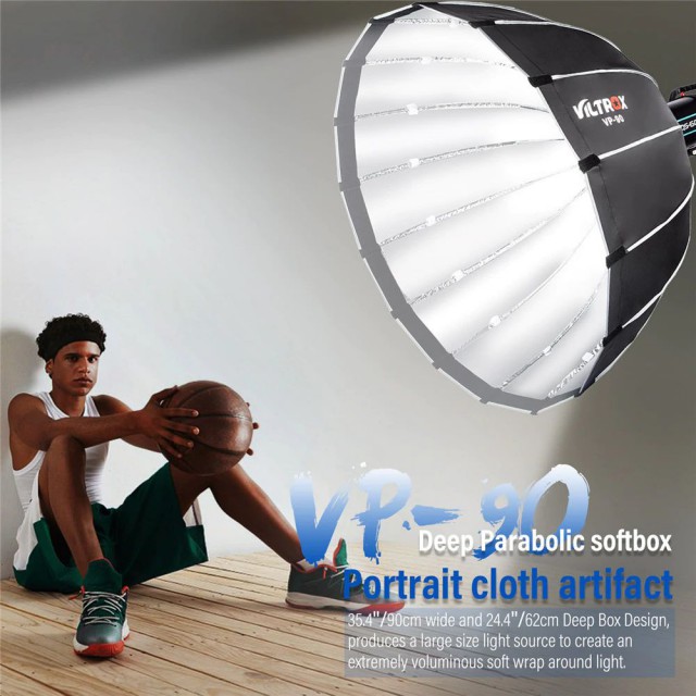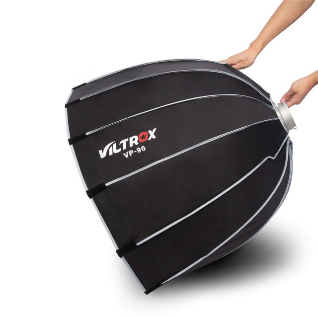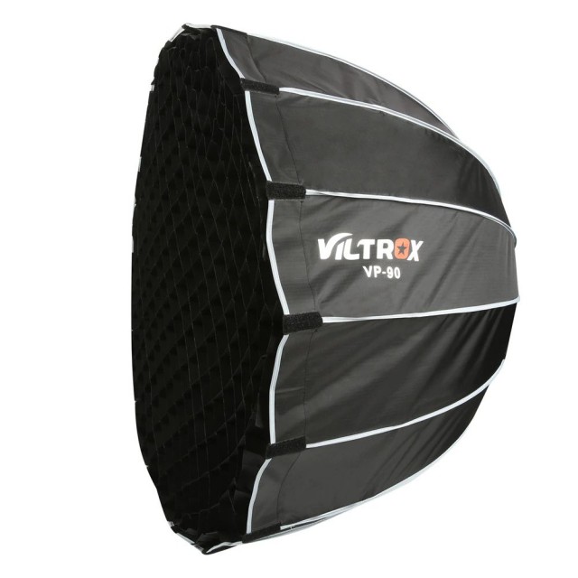 Softbox para el flash LED Viltrox Weeylite Ninja 400 (y otros con montura Bowens, como el Sokani x60, el Godox SL-60W, el VL150 o el Aputure 1202). Diámetro: 90 cm; profundidad: 62 cm; peso: 2,2 kg. El paquete incluye una bolsa de transporte y un filtro de panal.