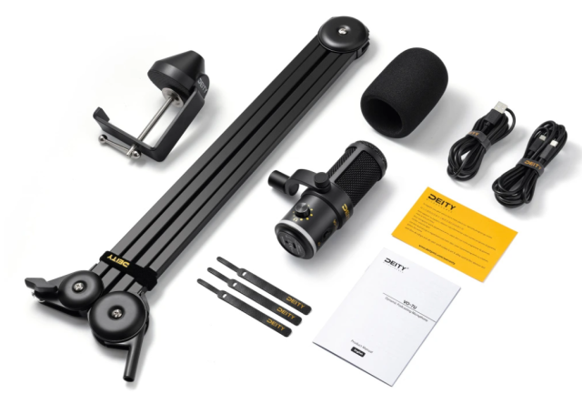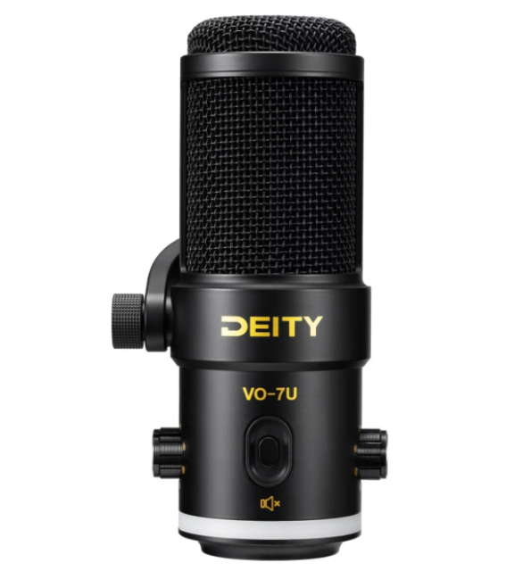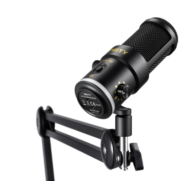 El micrófono USB para podcast Deity VO-7U + brazo (negro) es un micrófono dinámico USB profesional para podcasters y streamers que ofrece una amplia compatibilidad con dispositivos, un sonido nítido y sin ruidos, controles integrados e iluminación RGB personalizable.