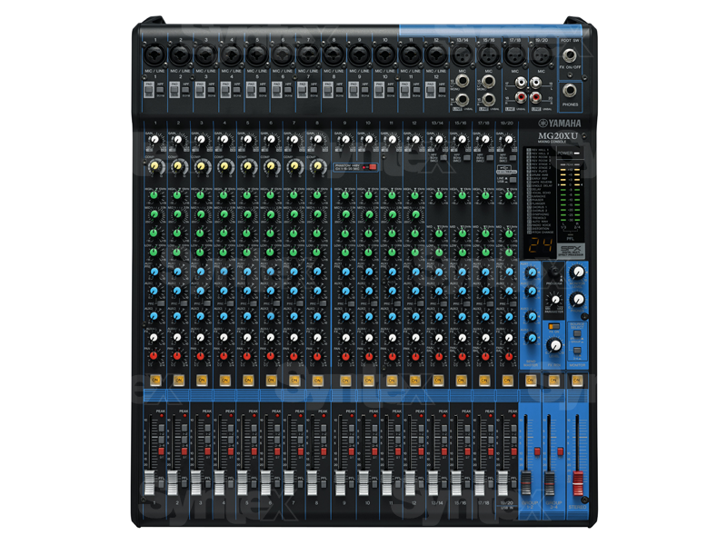 Cada uno de los canales del MG20XU cuenta con un nivel de envío dedicado al bus de efectos y hay 24 efectos predefinidos entre los que elegir. El nivel general del bus de efectos se controla mediante un control de nivel de señal de retorno de efectos dedicado. Estos efectos, que incluyen reverberación, retardo, phaser, flanger, chorus, trémolo, auto-wah, distorsión y otros, se pueden utilizar para que las voces y los instrumentos encajen mejor en la mezcla. El MG20XU se suministra con un kit de montaje en rack y un cable de alimentación.