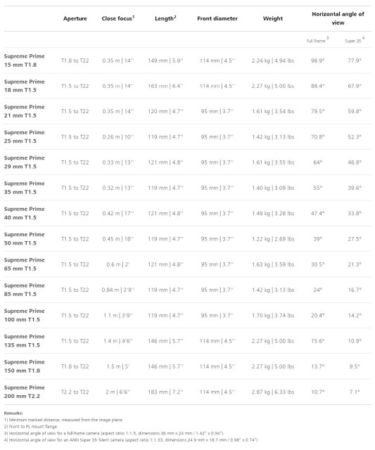 La gama de objetivos cinematográficos de alta gama ZEISS Supreme Prime ofrece la máxima uniformidad en todos los modelos: cobertura uniforme del sensor, reproducción cromática, luminosidad (T1,5 en la mayoría de los modelos), tamaño, peso y disposición de los controles. Todos los objetivos de la gama cubren de forma fiable los sensores FF (diámetro de imagen de 46,2 mm), son compatibles con la tecnología eXtended Data y, gracias a la tecnología de montura intercambiable «Interchangeable Mount System», son compatibles con las monturas PL, LPL y EF (los objetivos se suministran de serie con montura PL y marcas métricas).