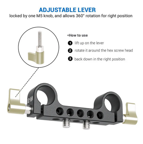 El ZGCINE 15mm Railblock es una abrazadera resistente con dos barras diseñada para sistemas de soporte con rieles de 15 mm. Cuenta con varios orificios roscados de 1/4''-20 para fijar accesorios y una tuerca de trinquete con resorte que facilita el ajuste en espacios reducidos.