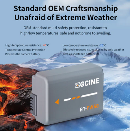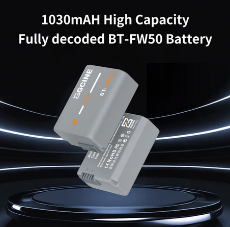 La ZGCINE BT-FW50 es una batería de repuesto totalmente compatible con una capacidad de 1030 mAh (7,2 V) de otro fabricante para cámaras Sony, que reproduce a la perfección la batería original NP-FW50 en cuanto a tamaño y funcionalidad —sin avisos, visualización completa de la información de la cámara— y, además, ofrece una carga ultrarrápida (carga completa en ~2 horas con los cargadores ZGCINE PS/PC) y una protección de seguridad premium de 8 capas.