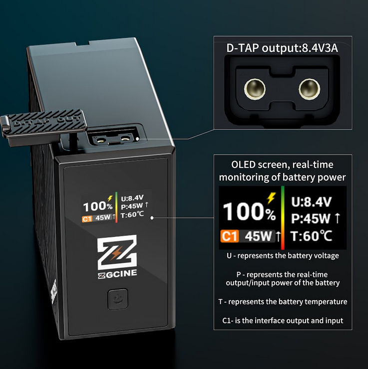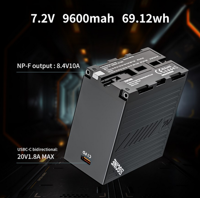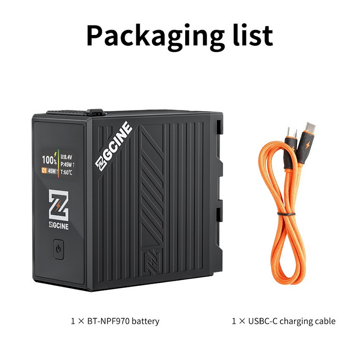 La ZGCINE BT-NPF970 es una batería compacta de iones de litio de la serie L con una capacidad de 9600 mAh (69,12 Wh), que cuenta con carga rápida PD de hasta 36 W, salidas D-TAP (8,4 V/3 A) y NPF, monitorización de tensión, potencia y temperatura en tiempo real en una pantalla OLED y protecciones de seguridad integrales: ideal para alimentar equipos de vídeo profesionales, monitores y luces.