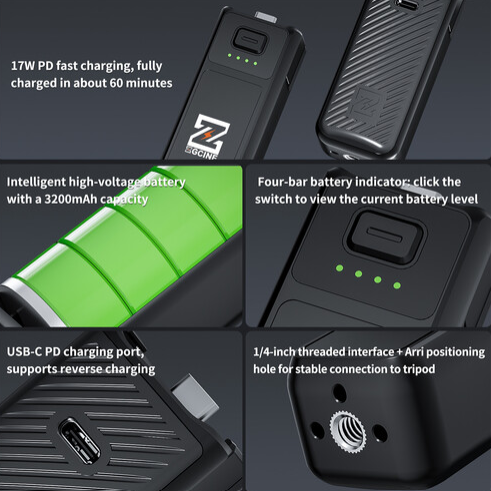 La batería ZGCINE PK-H01 es un accesorio de alto rendimiento para las cámaras DJI Osmo Pocket 3, que ofrece una batería inteligente de alto voltaje con una capacidad de 3200 mAh para grabar sin problemas. Gracias a su diseño compacto y ligero, es fácil de transportar, mientras que la carga rápida PD de 17 W permite cargar completamente la batería en aproximadamente 60 minutos. El mango admite la carga a baja temperatura con un ruido eléctrico mínimo, la carga inversa a través de USB-C PD y está equipado con un indicador de estado de la batería de cuatro posiciones para un seguimiento en tiempo real. Gracias a su interfaz roscada de 1/4 pulgadas y al orificio de posicionamiento Arri, garantiza una conexión estable a los trípodes. Además, permite la transferencia directa de datos a ordenadores para acceder cómodamente a los archivos de la tarjeta de memoria.