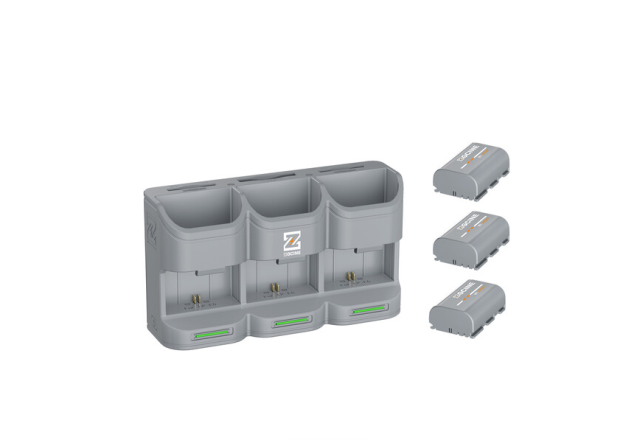 El kit de estuche de carga de viaje ZGCINE PC3-LPE6P incluye tres baterías LP-E6P de alta capacidad (2600 mAh) y un estuche de carga compacto de color gris, que proporciona una fuente de energía portátil y fiable para cámaras Canon, cámaras Blackmagic Pocket Cinema, modelos Z CAM y accesorios compatibles, como empuñaduras, soportes y sistemas inalámbricos de control de objetivos.