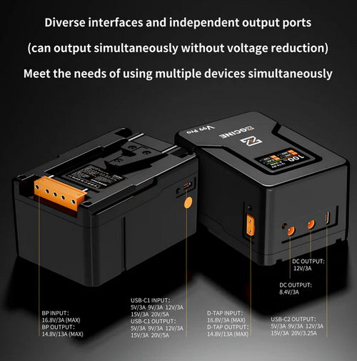 Gracias a su amplia compatibilidad, la ZG-V99Pro funciona sin problemas con una gran variedad de dispositivos, incluyendo videocámaras, monitores de cámaras, luces LED de vídeo, teléfonos inteligentes y ordenadores. Tanto si grabas en exteriores como en estudio, la ZGCINE V99Pro te proporcionará la energía que necesitas para que puedas concentrarte en tu trabajo creativo.