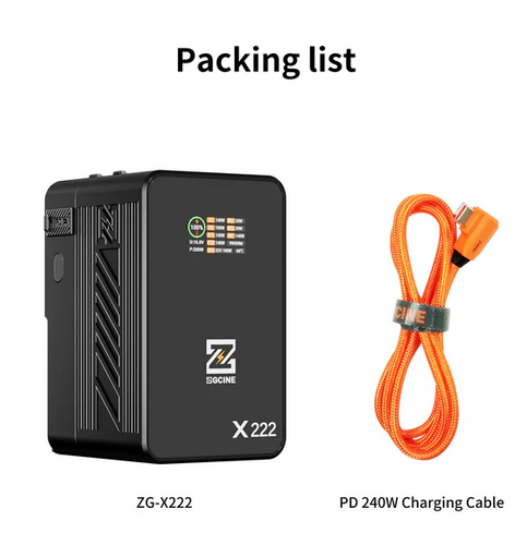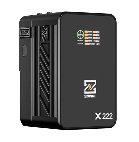 La ZGCINE ZG-X222 es una batería de alta capacidad con montura en V de 222 Wh, equipada con carga rápida bidireccional USB-C PD 3.1 de 140 W, capaz de alcanzar el 80 % de carga en tan solo 1,5 horas. Ofrece una amplia gama de puertos de salida, incluidos tres puertos D-Tap (uno con boost de 22 V), pioneros en el sector, y una pantalla digital inteligente de 1,4 pulgadas para supervisar el rendimiento en tiempo real.