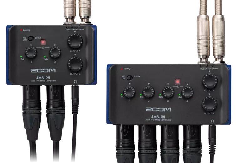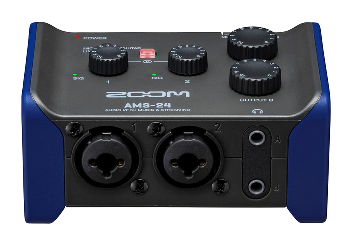 El AMS-24 es la solución perfecta para retransmisiones en solitario y sesiones con varios instrumentos. Ofrece dos entradas combinadas XLR/TRS con preamplificadores de bajo ruido de Zoom. También dispone de dos salidas de auriculares y dos salidas TRS para conectar monitores externos.
