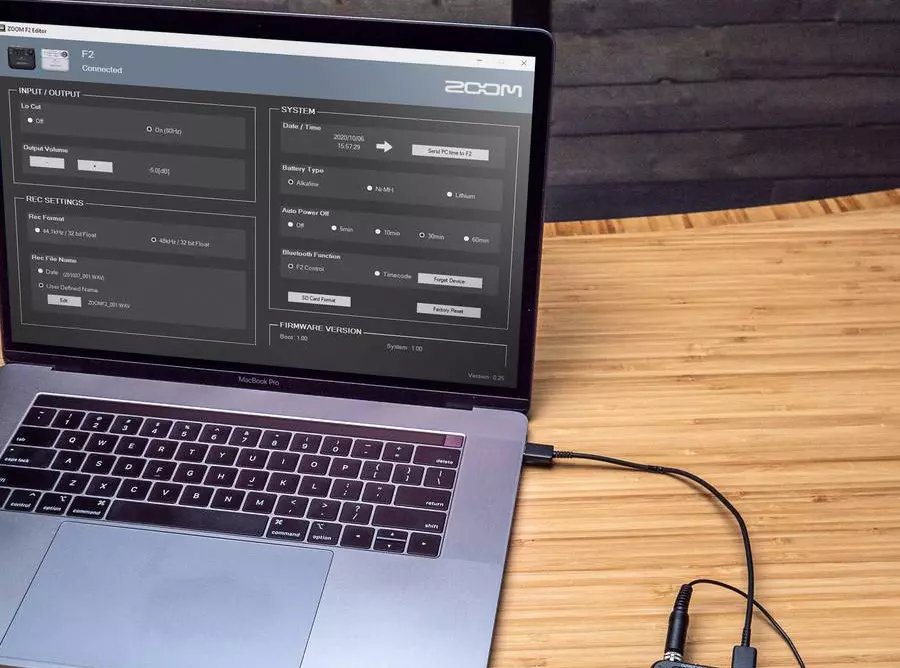 El F2 Editor para PC y Mac te permite modificar la configuración, formatear tarjetas SD y mucho más. Solo tienes que conectar el F2 mediante un cable USB e iniciar el editor. A través del USB también puedes transferir fácilmente archivos al ordenador.