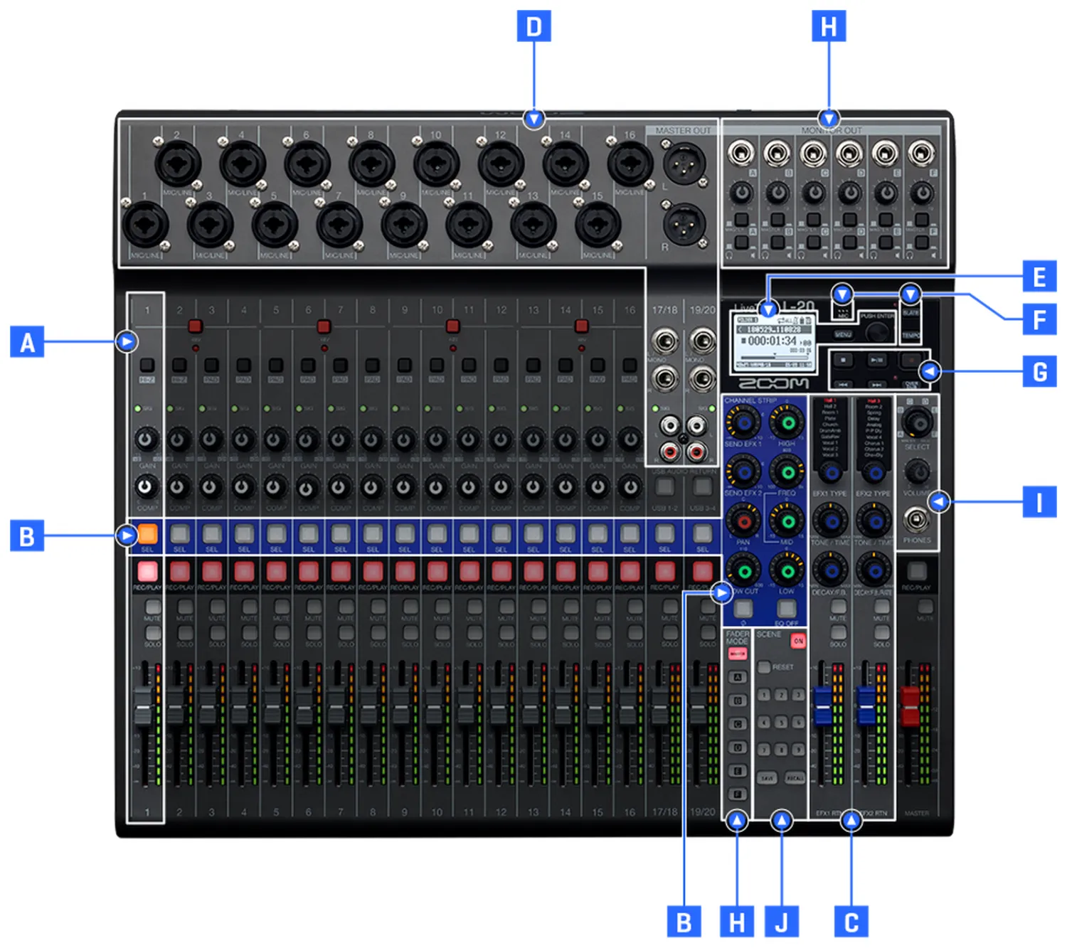 El LiveTrak L-20 está diseñado para mezclas más amplias. Cuenta con 20 entradas (16 entradas mono de micrófono/línea y dos entradas estéreo), todas con ecualizador paramétrico de 3 bandas independiente. Las dieciséis entradas mono ofrecen control independiente del compresor.